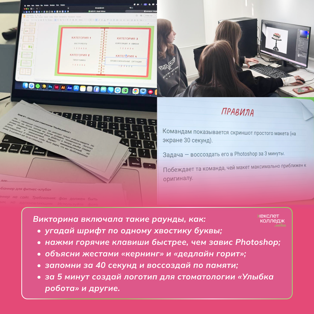 Программа квиза была разделена на несколько ключевых этапов, каждый из которых затрагивал критически важные аспекты профессии. Сначала ребята подтвердили свои знания фундаментальных основ — колористики и законов композиции. Затем условия усложнились: студентам пришлось в режиме реального времени реагировать на «горящие» правки, когда до сдачи проекта оставались считанные минуты. Завершающим испытанием стало решение технических вопросов допечатной подготовки, где любая ошибка могла стоить тиража.